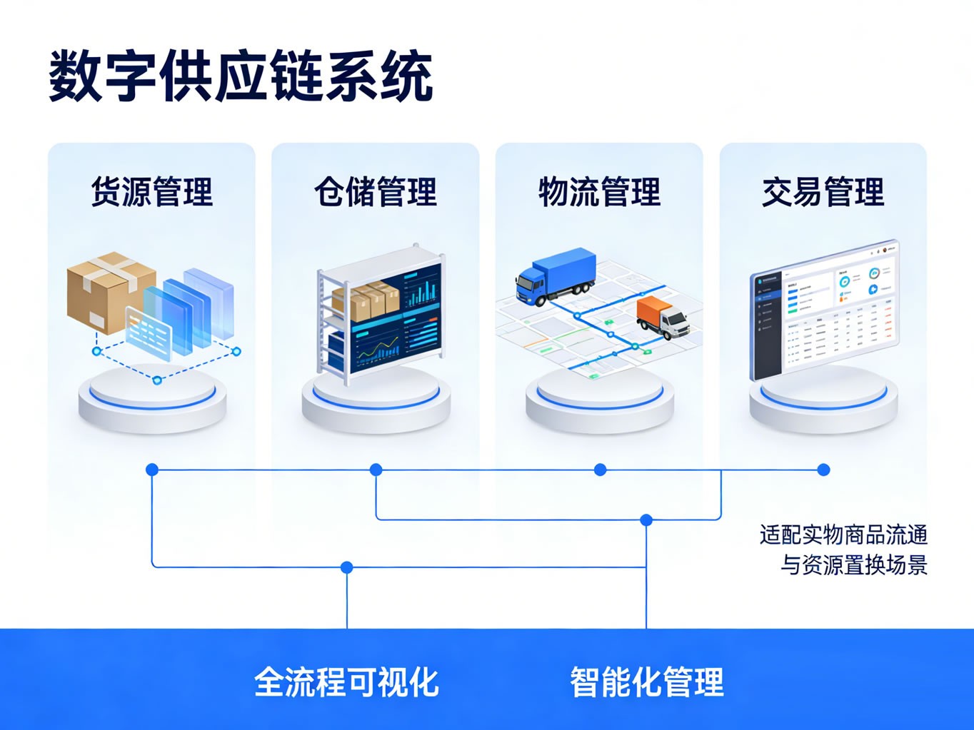 供应链全链路数字化管理平台,整合货源、仓储、物流、交易等各环节资源,实现供应链全流程的可视化、智能化管理,适配各类实物商品的流通与资源置换场景。